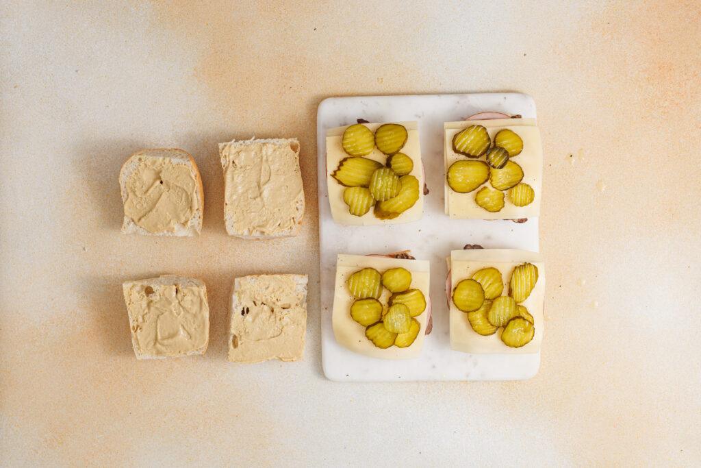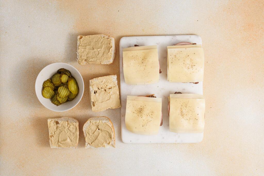 Step 2: On one half of the bread, layer the cooked pork, then ham, cheese, and pickles.