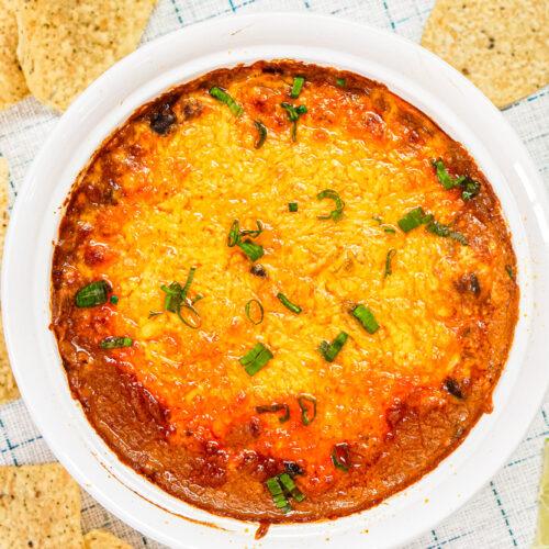 Bake for 25–30 minutes, or until the cheese is melted and the edges are hot and bubbly. For a golden, slightly crisp top, broil for an additional 1–2 minutes. Finish with a sprinkle of sliced green onions. Serve warm with tortilla chips!