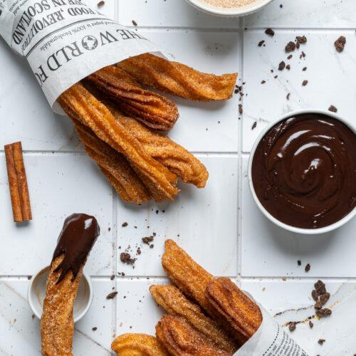 Remove churros with a slotted spoon and place them on a paper towel-lined plate to drain excess oil. Immediately toss the warm churros in the cinnamon-sugar mixture until well coated.