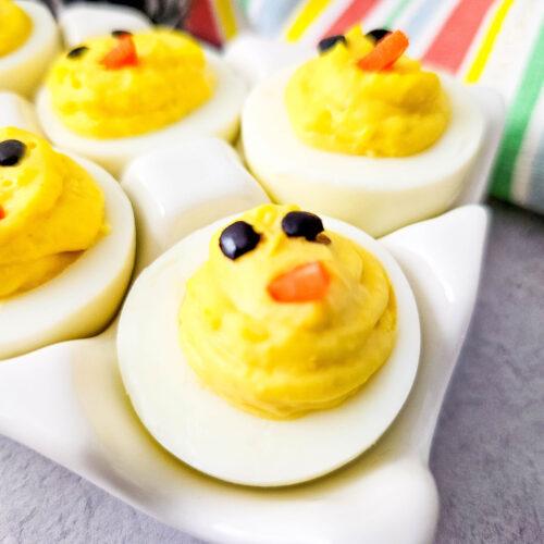 Add a “beak” into the center of the eggs, then eyeballs up top. You may want to use tweezers for applying the eyes.