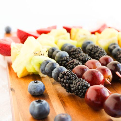 Assemble the skewers: start with a strawberry, then add orange, pineapple, kiwi, blueberries, blackberries, and grapes.